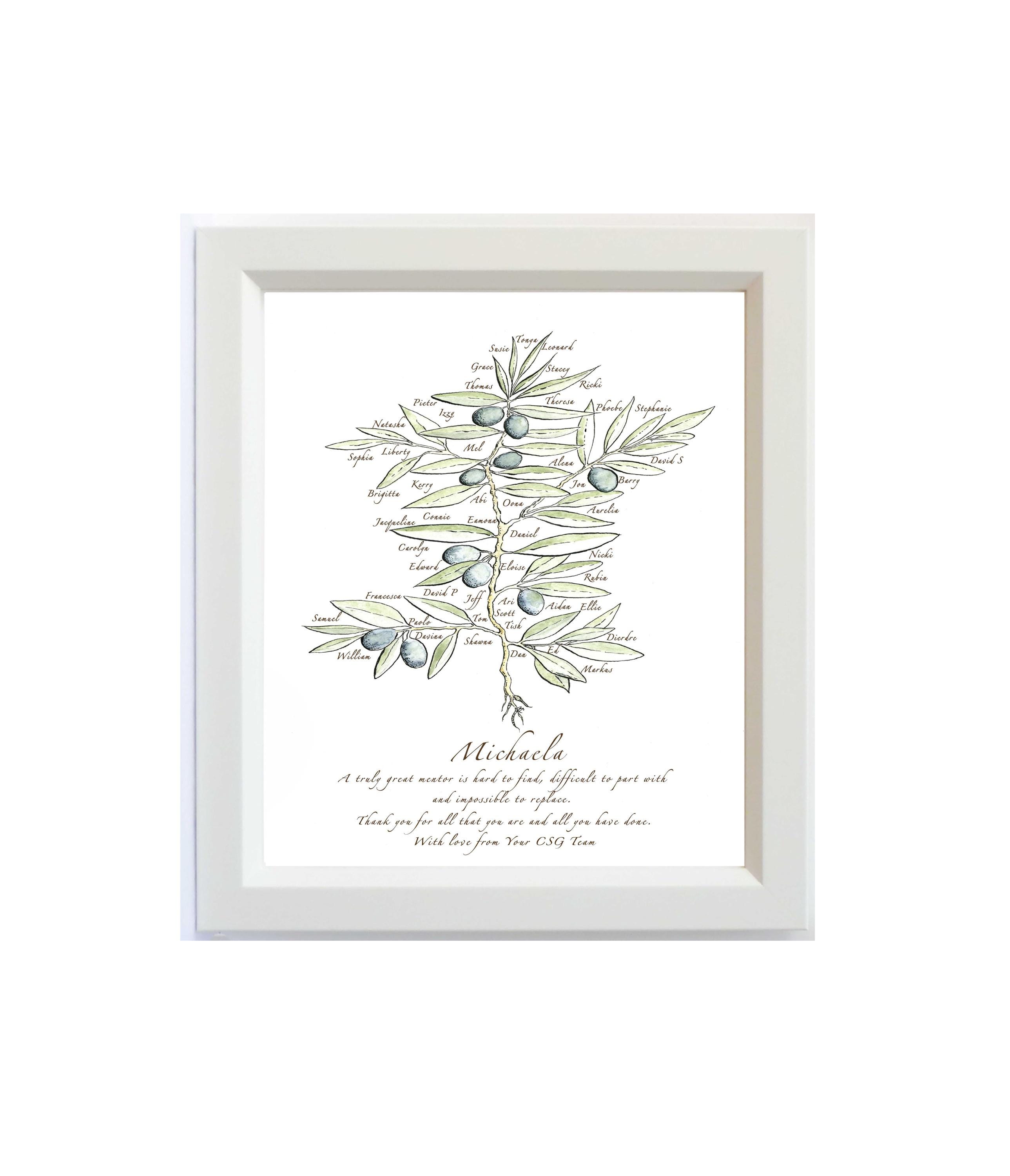 You can include any number of names which I will add to the artwork (an olive sprig which I painted in watercolours with indian ink). I'll adjust the font size to suit the number of names and will nestle the names amongst and around the olive leaves.
